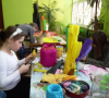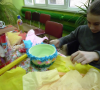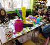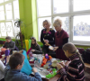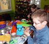 Uczestnicy stare i niepotrzebne naczynia zamieniali w dzieła sztuki. Uczyła pani Roma Szczerbień z Krosnowic, która ma w tym temacie nieskończenie wiele do powiedzenia. Na stole warsztatowym znalazły się garnki, słoje, donice, a nawet czajnik. Właścicielka czajnika pomysł na to naczynie przyniosła ze sobą – słoń. I tak też się stało. Dzieci bawiły się znakomicie.