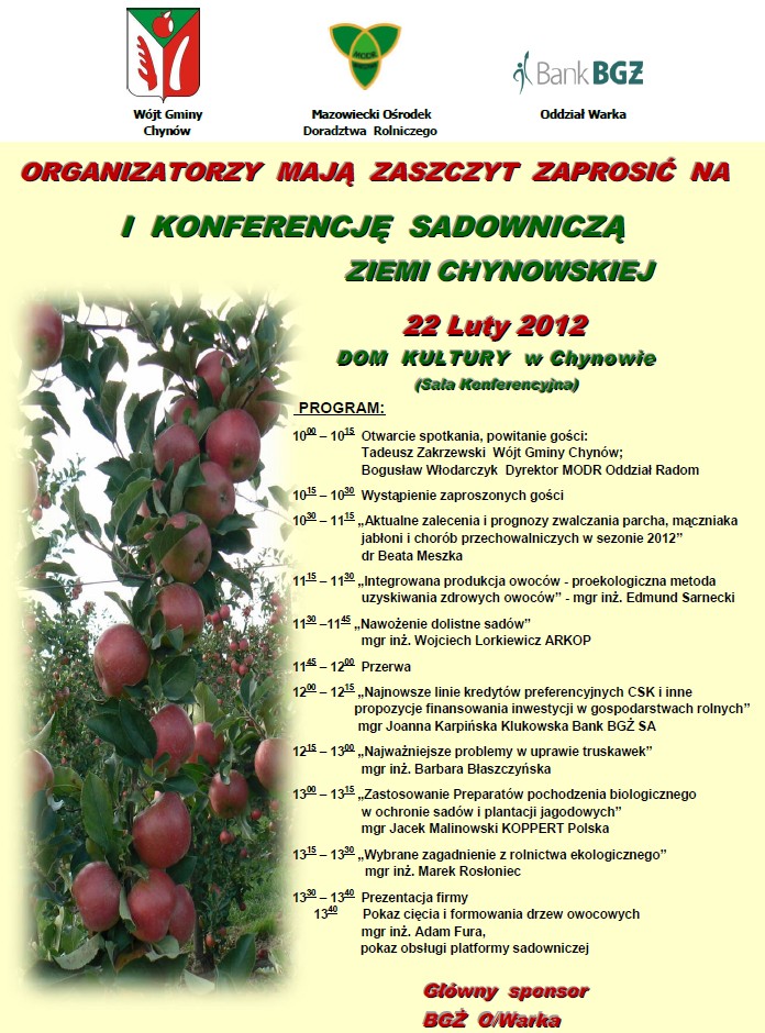 Wójt Gminy Chynów, Mazowiecki Ośrodek Doradztwa Rolniczego oraz bank BGŻ SA O/Warka mają zaszczyt zaprosić na "I Konferencję Sadowniczą Ziemi Chynowskiej", która odbędzie się w Domu Kultury w Chynowie (sala konferencyjna).